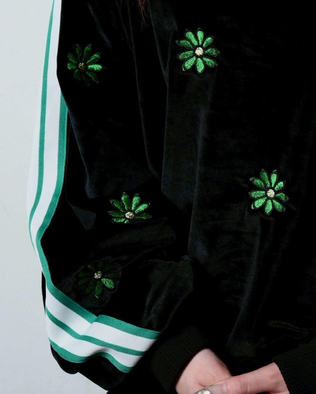SSSフラワーロゴを全面総柄刺繍したベロアライクなスウェット。