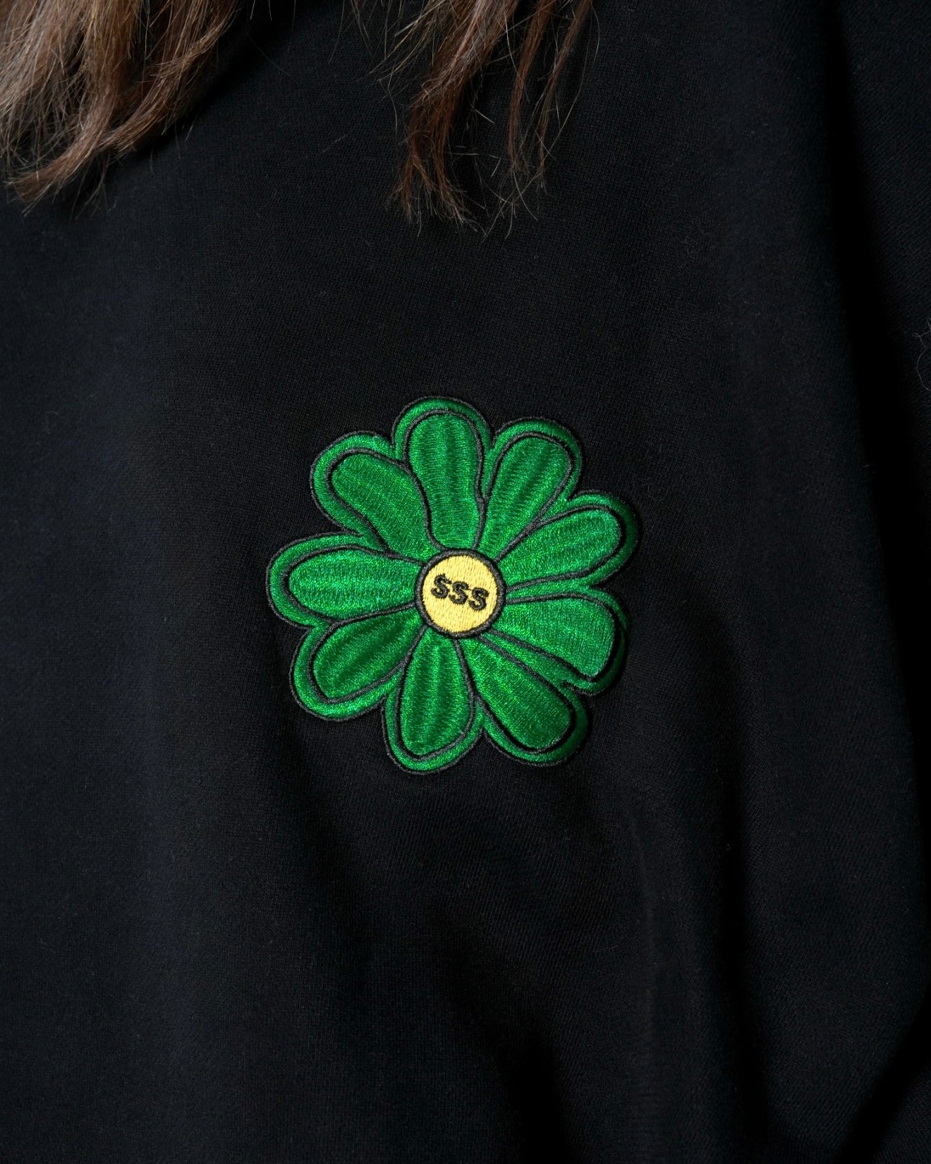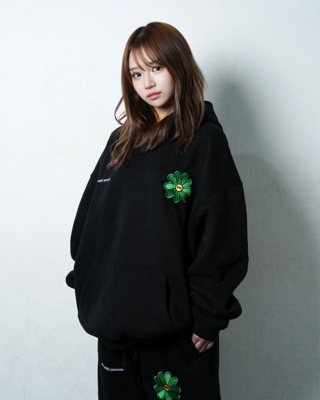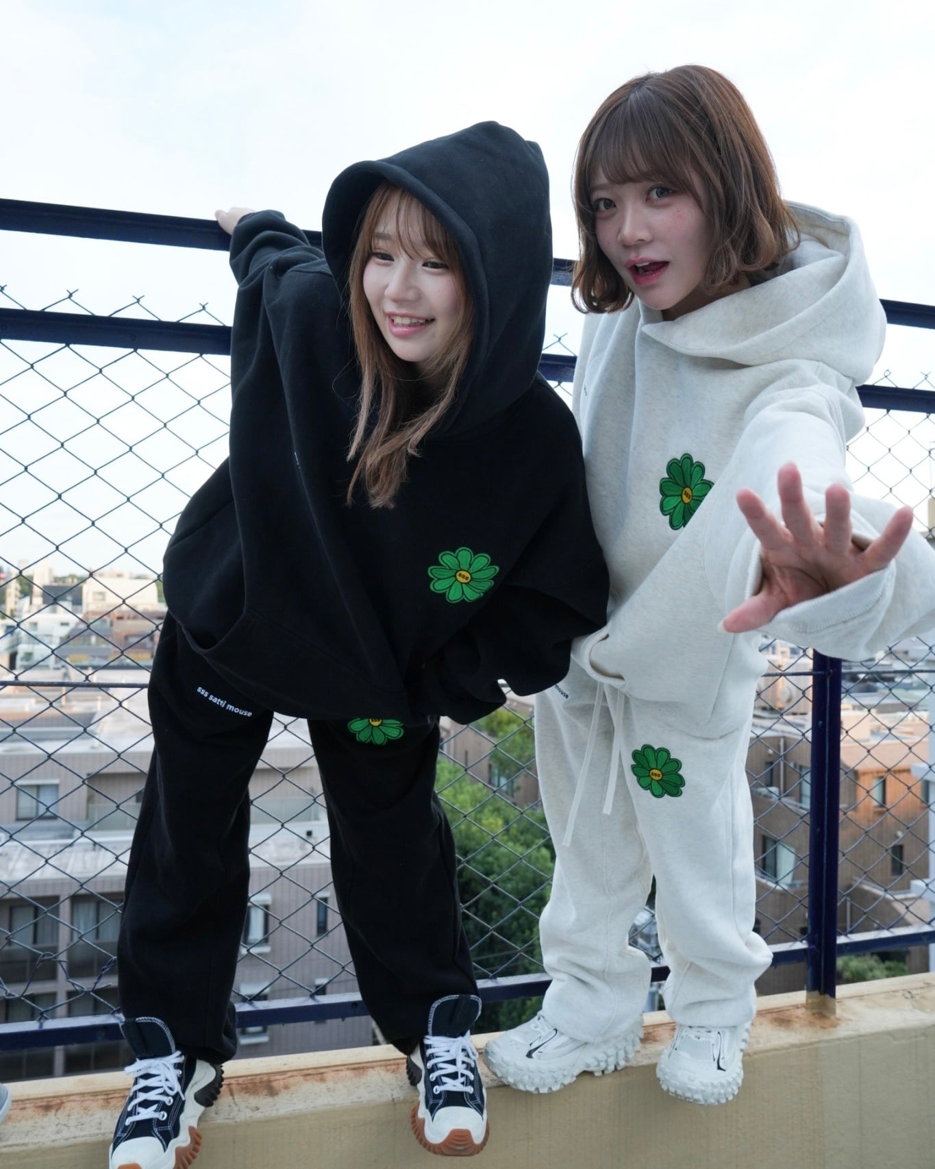 胸元と太もも部分に小さな花とブランドネームのワンポイント刺繍を施した寒い季節に最適な裏起毛セットアップ!