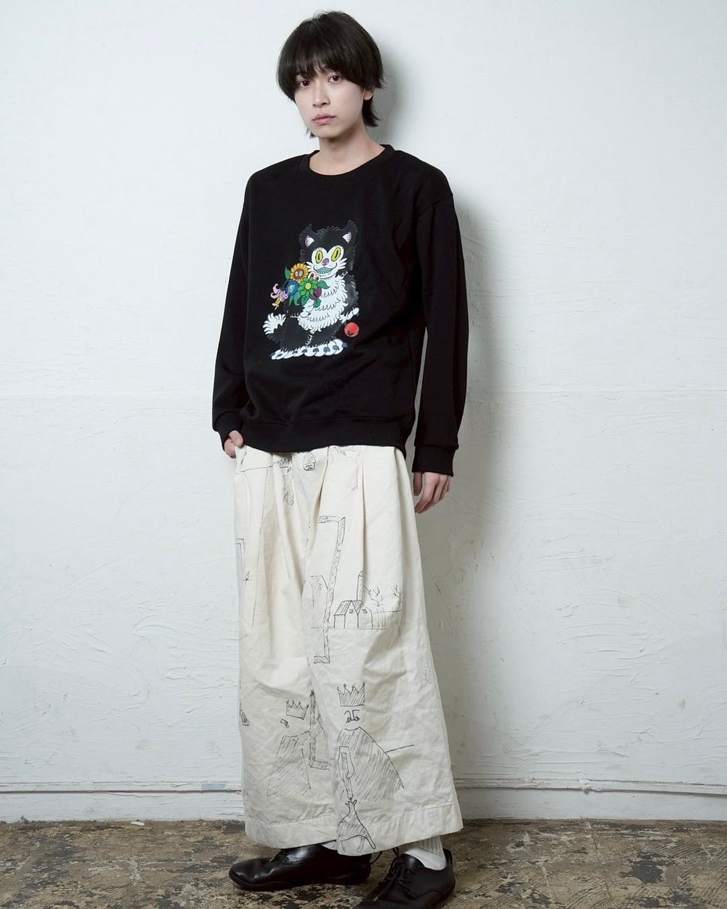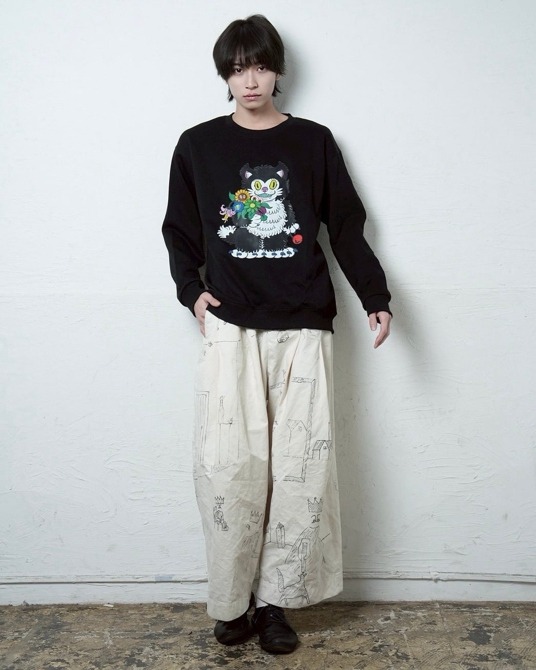 不思議で“コワかわいい”化け猫が抱える花束には、sss satti mouse のロゴをモチーフにした特別な花が隠れており、コラボならではの遊び心あるデザインです。