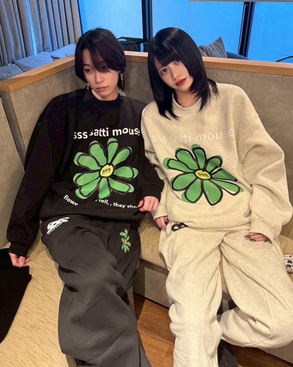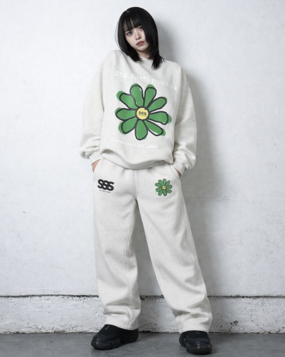 胸元と太もも部分に小さな花とブランドネームのデザインを施したセットアップ!