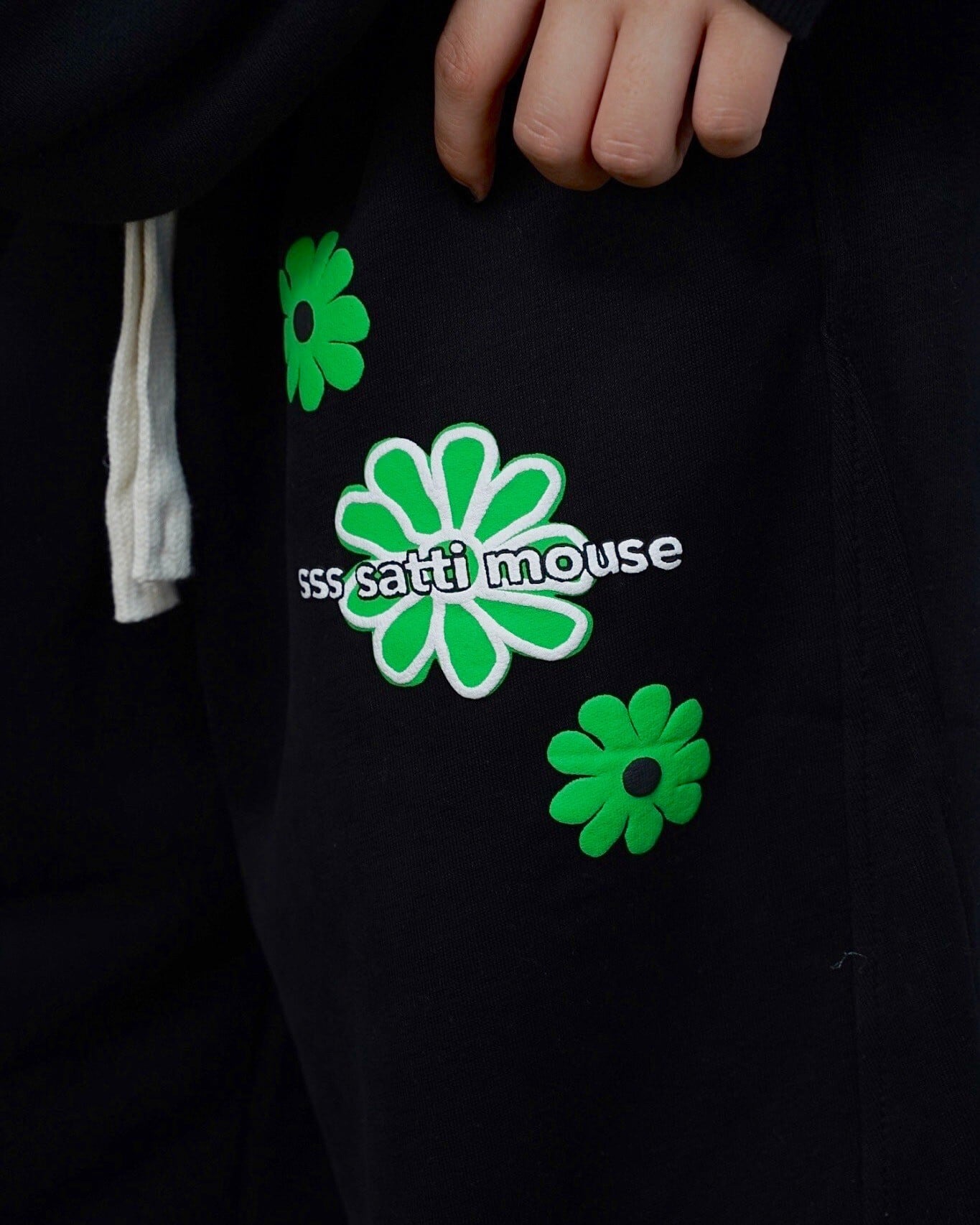 フラワーロゴを両脚に散りばめた新作パンツ。