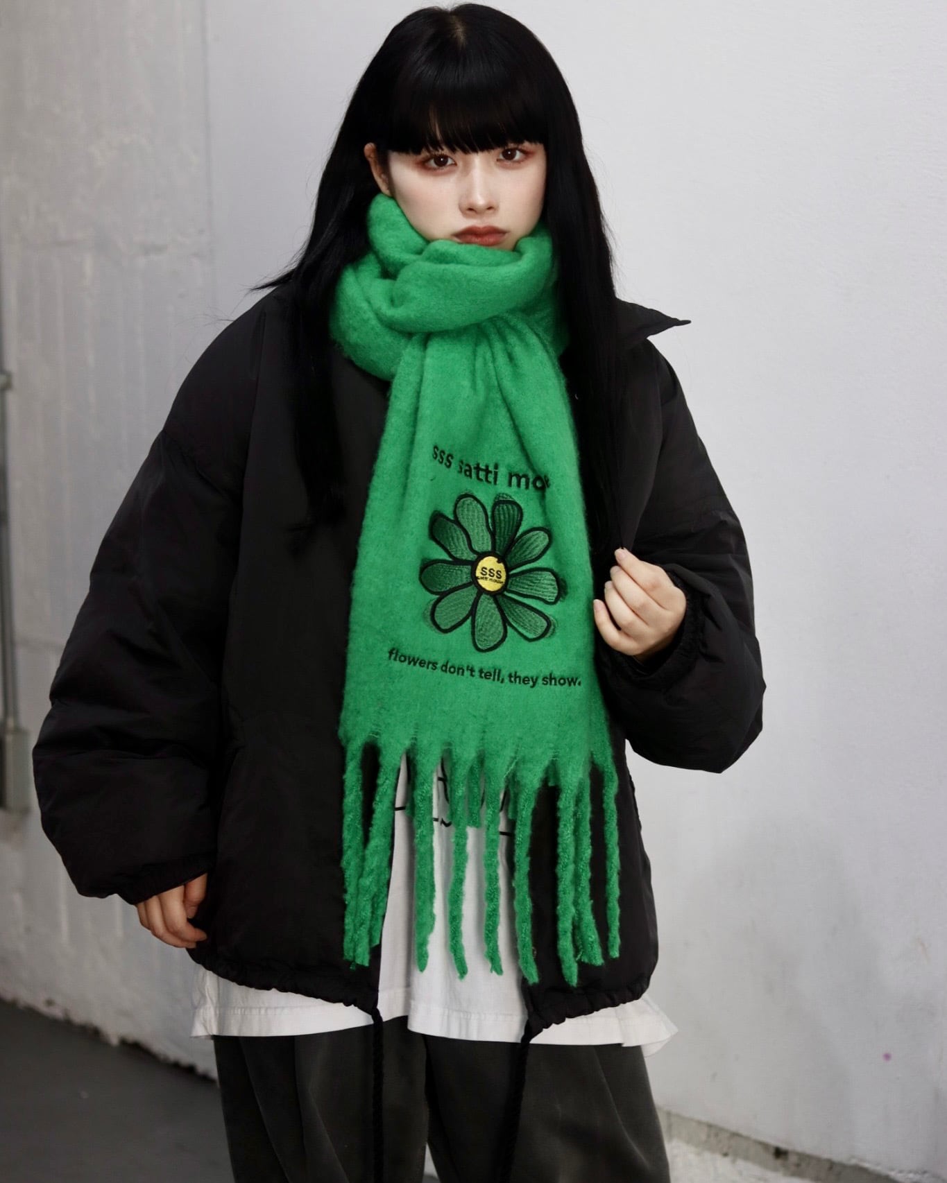 色違いでペアルックしたくなるカラバリ豊富なラインナップに、SSSのLOGOを全刺繍し、両端にフリンジを施した大判マフラー。